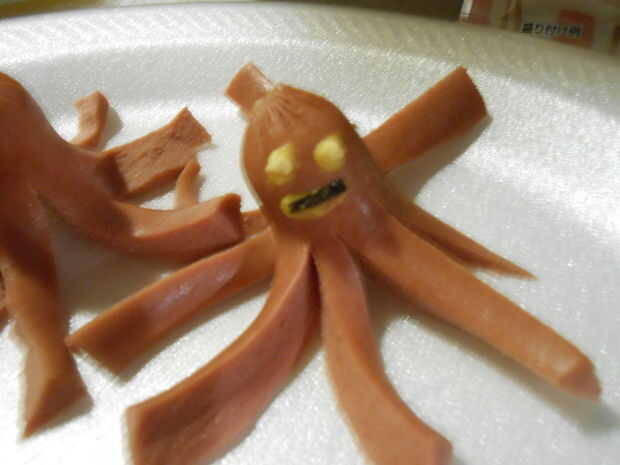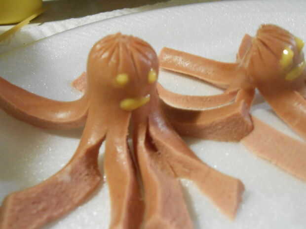 Utilizamos mostazas caras y hasta algunos pequeños trozos de Nori (algas secas) para las bocas. Salsa hace un efecto de la alga marina Linda, pero estos chicos ni siquiera mirar lindos nadar en una taza de caldo de pollo! Así que deje que los niños se divierten haciendo y decorando sus amigos bajo el agua!