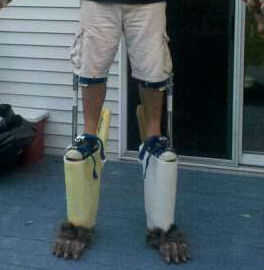 Ahora con la extensión de pierna completa y tu pies espuma llena y une el siguiente paso es cortar un pedazo de tu piel (material) y piel (material) al tamaño de la extensión de la pierna entera, cubrirlo con cemento de contacto, dejar secar un poco y fijar la piel (material). En una nota lateral si juegas para colocar a su traje (traje) por favor deje usted mismo pelaje extra (material) medido desde la parte superior de su extensión al poco por encima del codo, añadir la parte suave del velcro en la parte inferior de la parte superior de la piel (material) para la conexión de proceso que se revisar esto en el paso del cuerpo. Hay que ir!!! Su extensión es completa!
