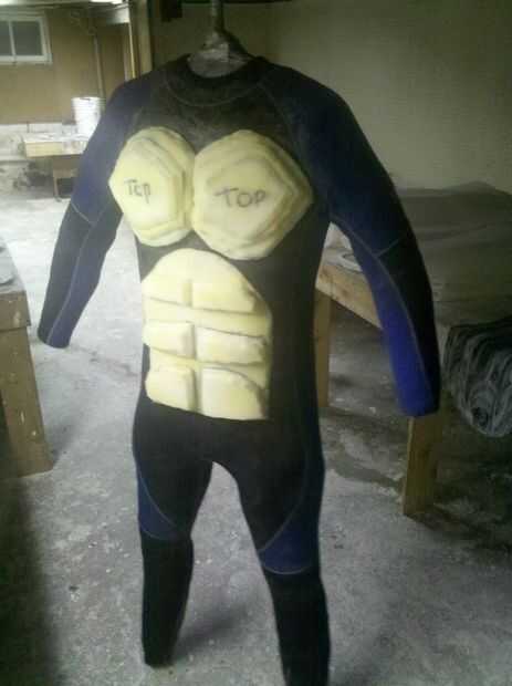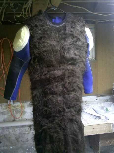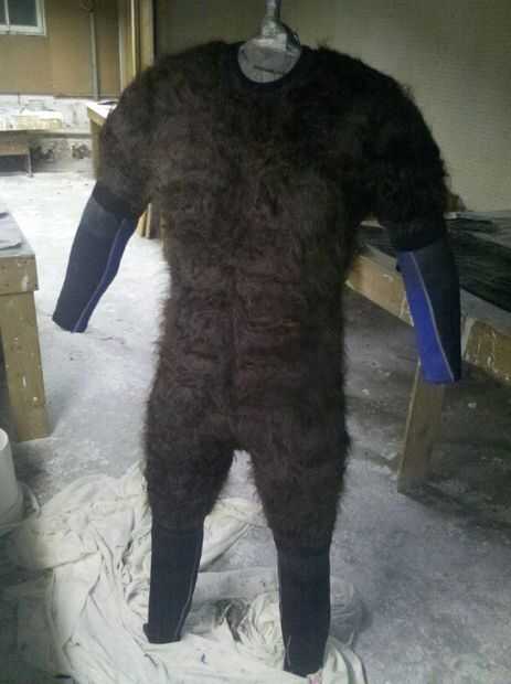OK, volver a trabajar. A continuación estará poniendo en la piel (material). Lo primero que tendrá que hacer con este primer paso será cubrir el traje entero incluye la espuma en el cemento de contacto (esto sería un buen momento para volver a tus extensiones y completamente capa en contacto así de cemento). Dejar secar e ir a buscar su piel (material). Esto las costuras muy bien siendo de pelo largo por lo que sugiero hacer estos pasos. Quisiera comenzar con el pecho y envuelva a la vuelta. Así que cortar su piel (material) y cubra la parte posterior con cemento de contacto, dejar seco!! ¿Ven un patrón aquí? Una vez seco poner la piel (material) en. OK ahora antes hacia los brazos y las piernas hay un par de cosas que hay que hacer primero. Desde que salió de extras piel (material) mide justo por encima de los codos y las rodillas y coloca el Velcro suave en la parte superior de la piel (material) necesitamos lo mismo para el traje. Coloque la parte dura del Velcro justo por encima de los codos y las rodillas. Con el Velcro en el lugar usted necesitará añadir el pelo (material) a los brazos y las piernas. Corte el pelo (material) en un semicírculo, vas a tener que medir desde la parte superior del hombro hasta la parte superior de la cinta de Velcro y en todo el brazo. Una vez cortada debe cubrir tanto el los brazos y la piel (material) con cemento de contacto, deje secar y poner tu piel (material) en su lugar. Brazos de hecho como para las piernas cortar el pelo (material) en un cilindro, tendrás que medir desde la parte superior de la pierna a la parte superior de la cinta de Velcro y todo. Una vez cortada debe cubrir las piernas y la piel (material) con cemento de contacto, dejaron secar y colocar su piel (material). Ahora las piernas se hacen así. En este punto todo debe tiene que hacer es tirar de la piel extra dejó en sus extensiones de las patas para arriba como los pantalones Velcro ellos en su lugar, tire de la piel extra que dejaron en las extensiones de su brazo para arriba como una camisa de manga larga de Velcro en lugar y debe tener un traje completo.