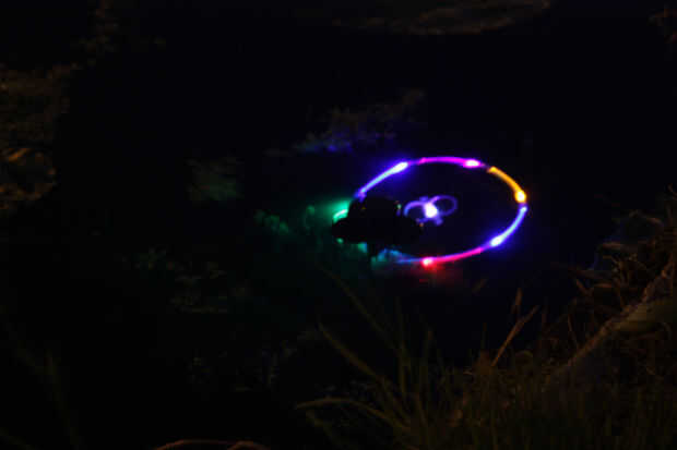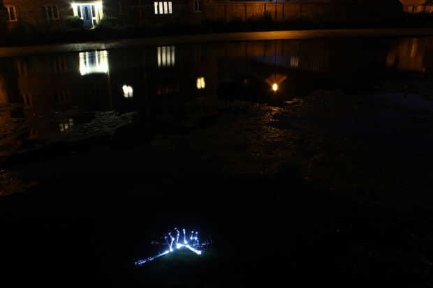 Básicamente tomamos algunos barato solar LED luces del jardín y volver a hackearles en las formas de las criaturas, usando sobre todo el pegamento caliente. El flotador de paneles solares en la superficie del agua como cojines del lirio y las criaturas de LED están sumergidas unas pocas pulgadas debajo de la superficie para que su resplandor es visible desde el Banco, pondside o camino de sirga del canal.
