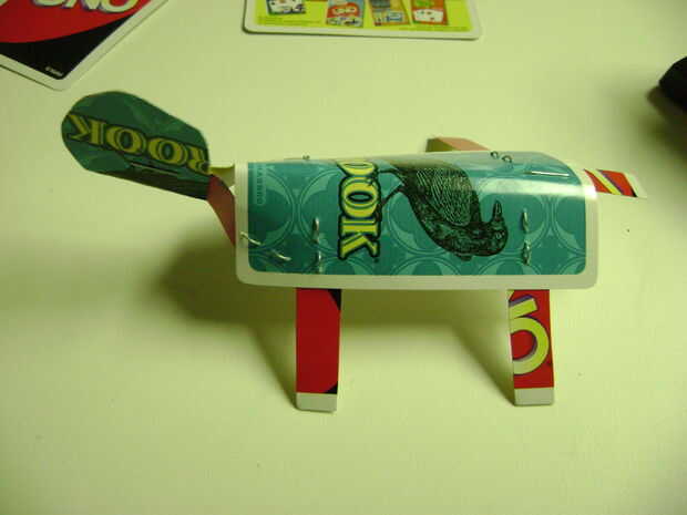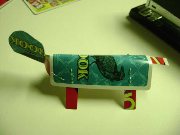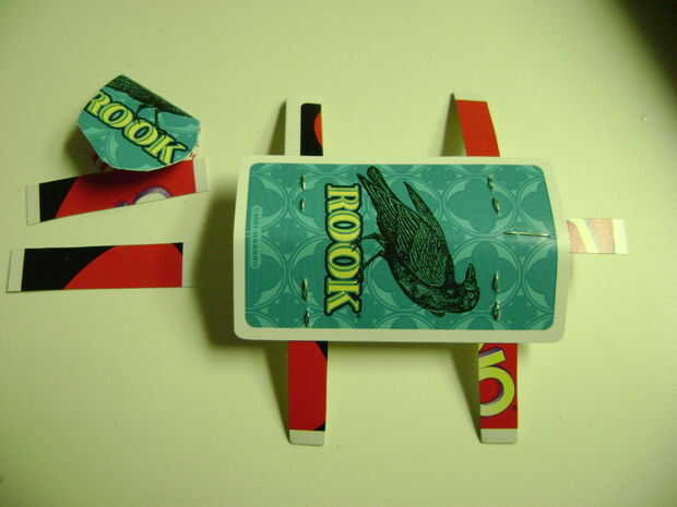 3. Corte una tarjeta en 8 piezas (aunque sólo utilizaremos 7) ancho. Estas serán las patas, cola y cuello piezas.