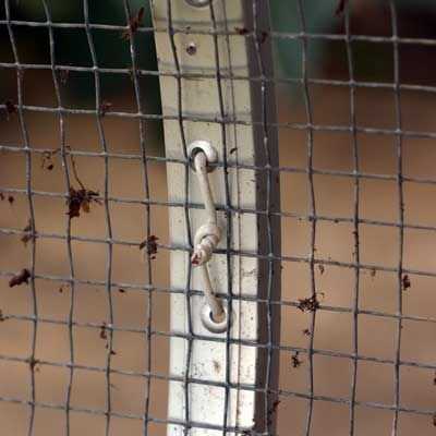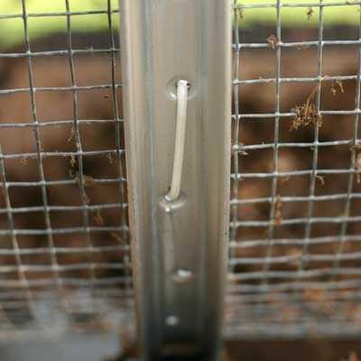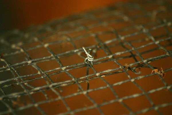 Coloque el paño del hardware dentro de los bordes y conecte con los cables por los agujeros de radios. He utilizado plástico #14 hogar eléctrico alambre revestido. Para sujetar la costura del tubo utilicé alambre #18. (Tenga cuidado de no sobre apretar el cable o el alambre se romperá). Asegúrese de que el alambre en la parte exterior de la llanta es acostado para que los rodillos no golpear sobre ella.