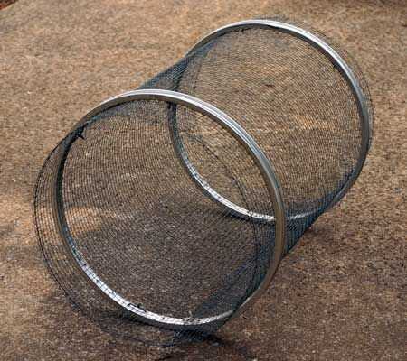 me inspiré por el tamiz de compost de rueda de bicicleta ( Mientras que la limpieza de un vecino de la vertiente había acumulado un par de ruedas de bicicleta y unas mallas. He enrollado el alambre en un cilindro y cortar la tira final para revelar m