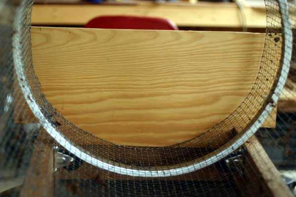 me inspiré por el tamiz de compost de rueda de bicicleta ( Mientras que la limpieza de un vecino de la vertiente había acumulado un par de ruedas de bicicleta y unas mallas. He enrollado el alambre en un cilindro y cortar la tira final para revelar m