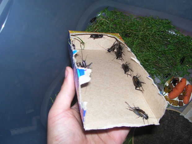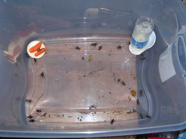 SUGERENCIAS agregar alguna hierba (no tierra) o maleza para dar tracción a los grillos, este recipiente es una bañera de 62 litros y no puede subir por las paredes. Sería útil disponer de una tapa en el recipiente para mantener los enemigos naturales de los grillos. Hay una cierta mosca que es un parásito para el grillo y se esconde en la parte inferior. La suciedad en la imagen final es utilizada para los grillos para poner huevos allí (segundo instructable).