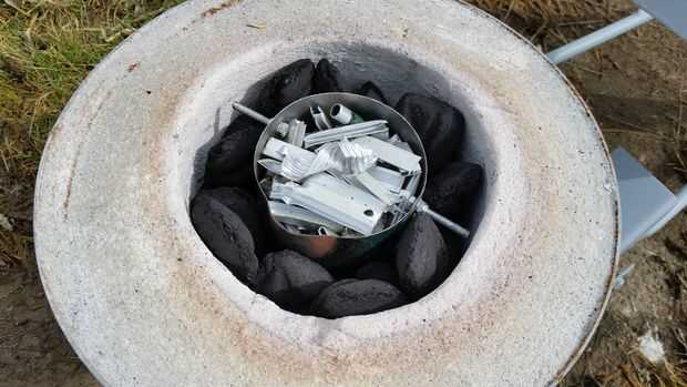 Luego coloca el crisol completo en la planta de fundición y había rodeado con las brasas, me lleno lo suficiente para mantenerlo seguro pero también facilitan la luz usando un soplete de propano y estaba listo para ir.