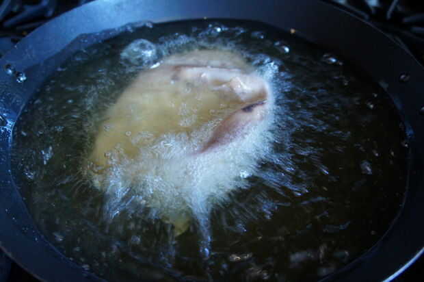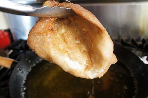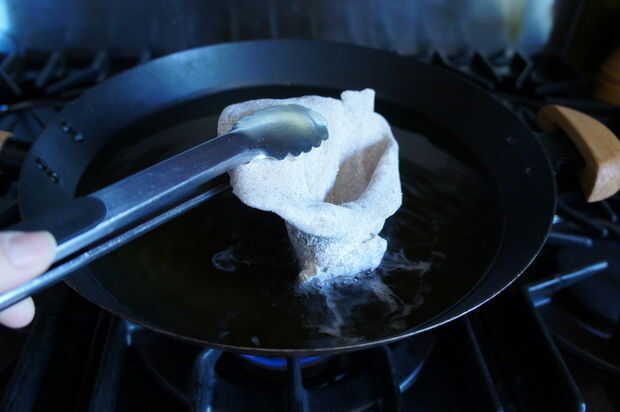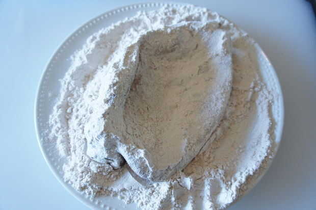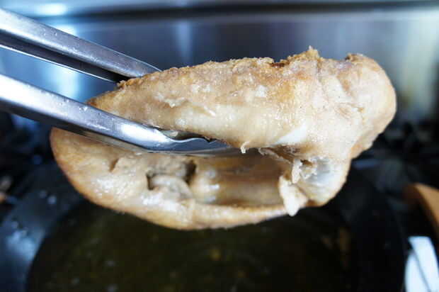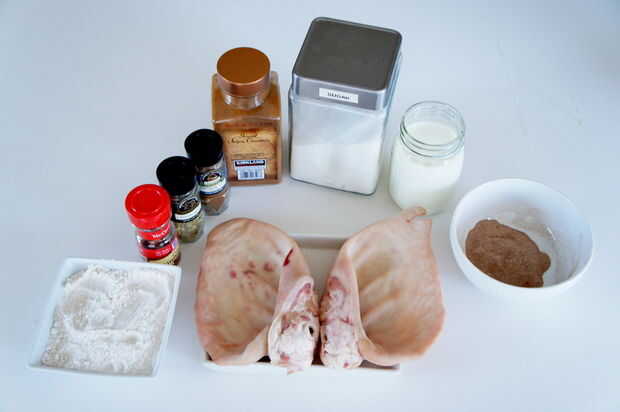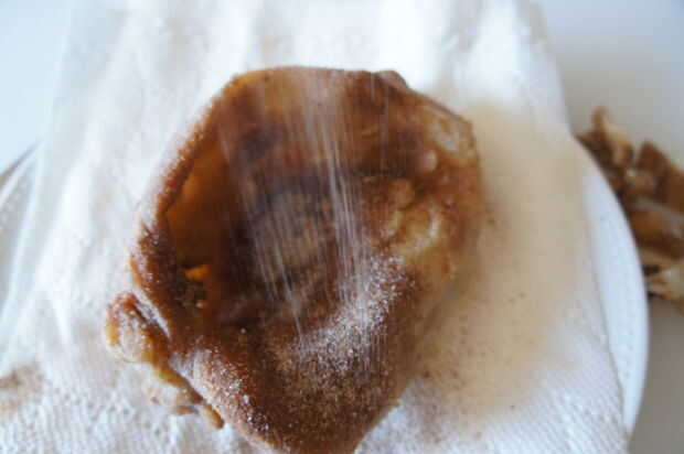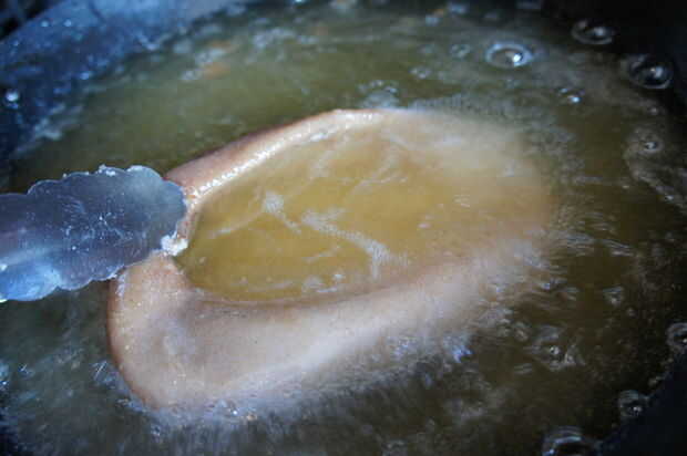 Al día siguiente, sacar las orejas del frigorífico. Pat les seca con una toalla de papel para eliminar cualquier humedad. Calentar el aceite. Colocar el aceite en un wok o una olla grande de fondo pesado. He utilizado un wok. Poner el aceite a 350 grados antes de freír. Configurar una estación de trabajo con harina, leche y 1/2 taza de la mezcla de especias. Añadir 1/2 taza de la mezcla de especias canela a la harina y revuelva para combinar. Dragar cada oído en leche y después en harina. Coloque en un plato hasta que el aceite se calienta.