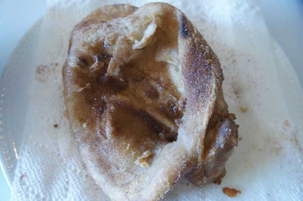 Tiene un protector de salpicaduras listo y una placa para horno forrada con papel de cocina para eliminar las grasas sobrantes. Una vez que el aceite está caliente, use un par de pinzas y Coloque suavemente la oreja en el wok. Déjelo freír por 4-6 minutos o hasta que esté ligeramente dorado. Use un par de pinzas y recoger la oreja y sacuda suavemente el exceso de aceite en el wok. Poner el oído en una toalla de papel. Espolvorear el oído generosamente con la mezcla de especias de canela azúcar. Dan la vuelta y repetir. Te recomiendo freír un oído a la vez. Utilice un cuchillo afilado para cortar las orejas en tiras del tamaño de bocado fino.