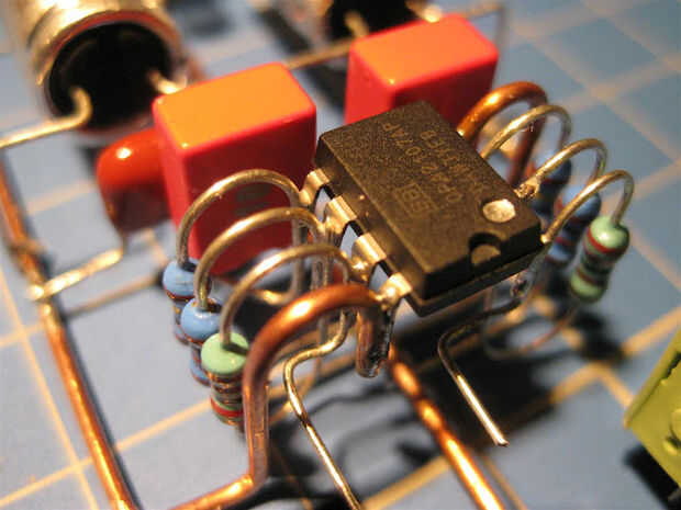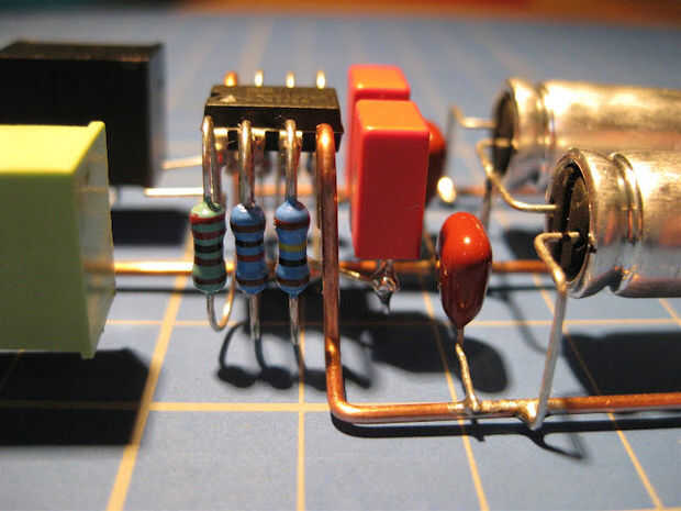 En la segunda foto las patas de las resistencias de turquesa están dobladas para formar la conexión de salida que va conectada a la toma jack de auriculares.