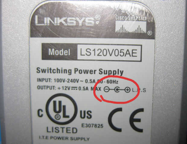 Usted también necesitará una potencia de suministro con un pin de centro positivo, esto se denota por el símbolo con el círculo rojo en la fotografía.