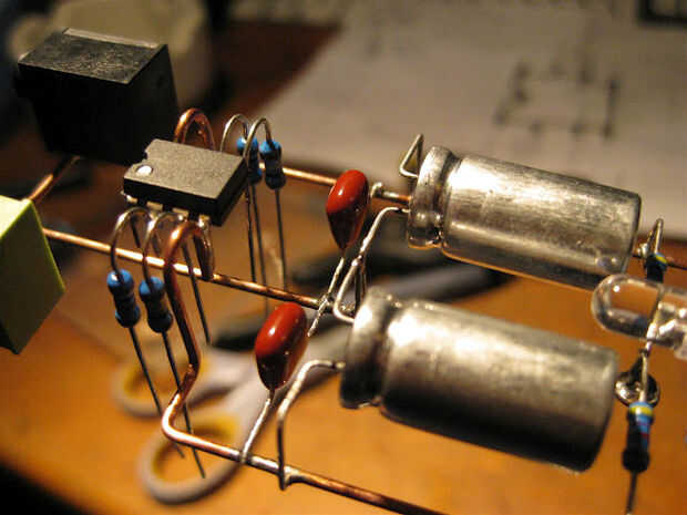 Los dos condensadores de 50v de 470uf plata grande son para las guías de suministro de energía seguidas por los dos condensadores de bi-pass rojo para la estabilidad del Op-Amp en caso de cualquier oscilación que en sentido estricto debe ser como cerca de las patas del Op-Amp como sea posible. Dicho que no he tenido problemas de estabilidad con este IC en otras Cmoys he hecho.