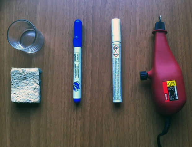 Conseguir un vaso que es de... cristal (el cristal se rompería) y es gruesa, un marcador de pizarra, un marcador de pintura de esmalte del color que te gusta, una esponja vieja y un grabador eléctrico lo suficientemente potente como para grabar vidrio.