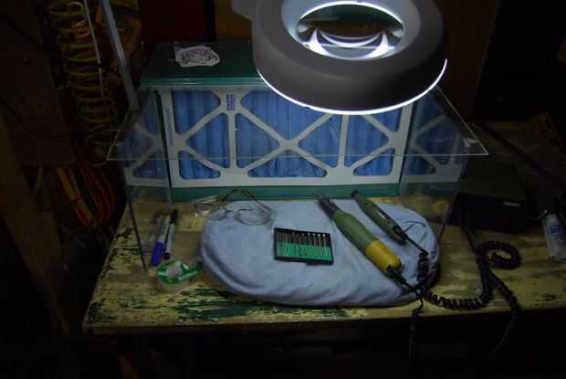 Mi herramienta favorita es un miniesmeril micro por aire. Yo tengo la mía en el puerto de carga. Creo que he cambiado la boquilla para que coincida con mis fresas. Corre muy rápido, es pequeño y se quedó en mi mano alrededor de $30. Se requiere un compresor de aire, sin embargo.