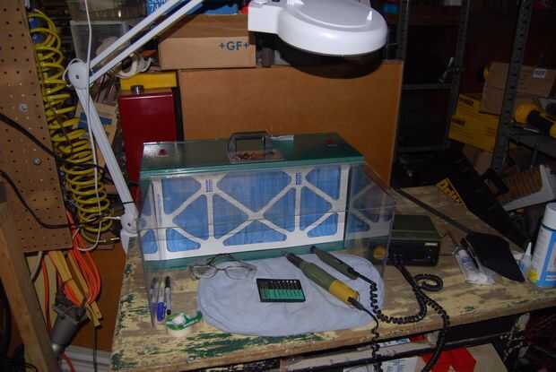 Coloque su lámpara para que puede proporcionar la iluminación directa o lateral según sea necesario. Poner la almohada frente al colector de polvo. Organizar la herramienta giratoria para que sea cómodo en la mano del grabado. Tienen su calcetín humedad cerca. Mi Proxxon tiene un lugar para colocar fresas repuestos en la parte superior la fuente de alimentación. Usted quiere ser capaz de cambiar tamaños fácilmente así que no intenta utilizar las rebabas del tamaño incorrecto fuera de conveniencia.