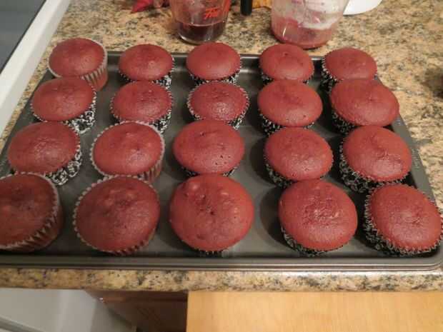 Llenar las tazas de 1/2-2/3 completo para conseguir cupcakes que introduce las tazas de papel sin hacer desbordamiento "muffin tops". Tazas blancas funcionan mejor Mostrar la torta roja a través de y más médicos. Las gotas también lucen mejores en ellos.