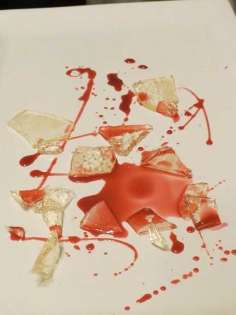 Rocíe un poco de sangre alrededor, tratando de hacer gotear sobre un único borde. Menos es más, no exagere. sangre gruesa funciona mejor. Una ensayo Magdalena en un plato separado funciona mejor.
