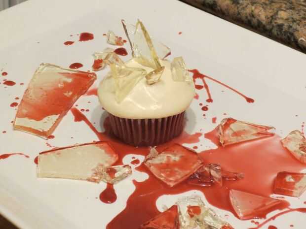Puñalada cada helado cupcake con unos fragmentos de vidrio de azúcar roto.
