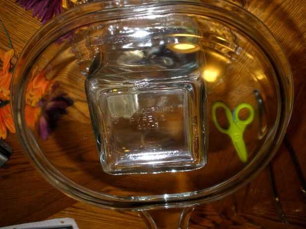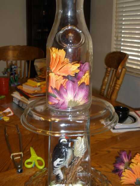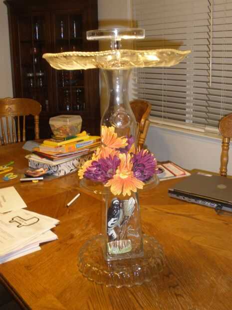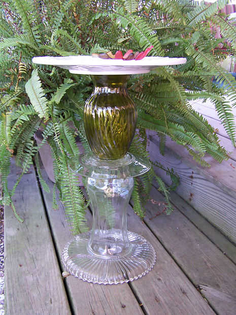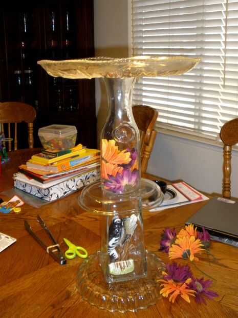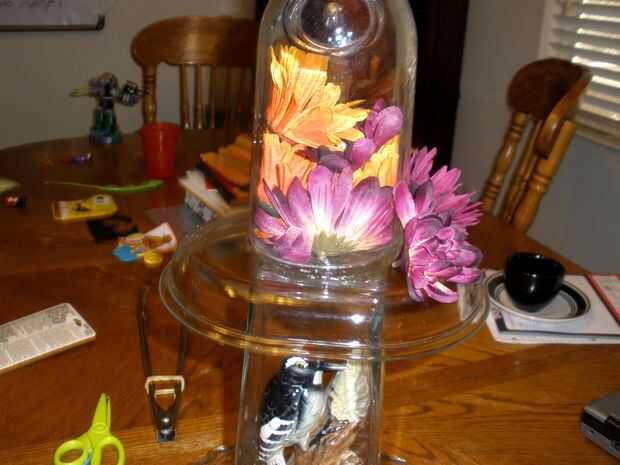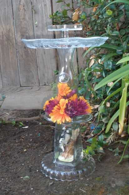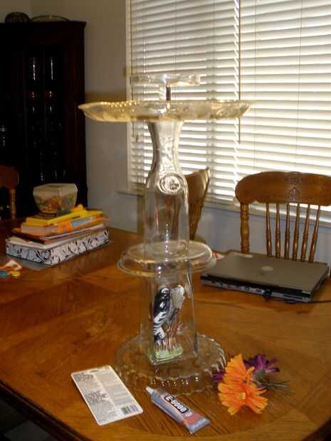 La placa de flor de Pascua que colocado encima de la jarra tiene una superficie de fondo irregular y voy a tener que traer el baño de pájaro de vidrio dentro durante la estación lluviosa para que agua no entrar en el decantador y arruinar completamente las flores en el interior de la jarra. Algo a tener en cuenta si poner flores artificiales en su proyecto.