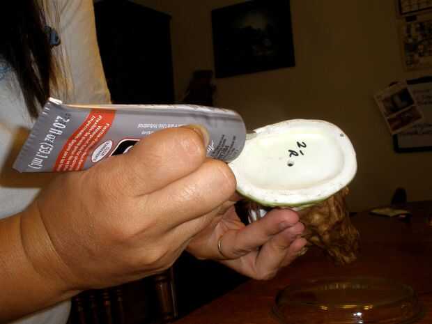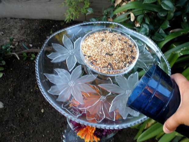 El pegamento de E-6000 establece específicamente no para utilizar para los animales, así que he decidido no pegar el sostenedor de vela (utilizado para mantener la semilla del pájaro) en la parte superior de la placa de la poinsettia (baño de aves ahora) donde el agua iba a ser.