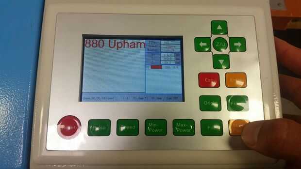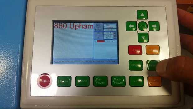 2. Mediante el panel de control del láser, fijar la altura de Z. Esto se hace presionando primero ' Z/U', luego con las teclas de flecha izquierda y derecha para mover la cama hacia arriba y hacia abajo. Utilice la tecla de enfoque a la posición de la superficie de su material la distancia correcta de la boquilla de láser. Presione 'ESC' cuando haya terminado de ajustar la altura Z.