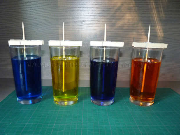 Cuando la mezcla tienetotalmente enfriado por inmersión los palillos mantenerlas con la pinza para la ropa. No debe tocar los bordes ni fondo de cristal.