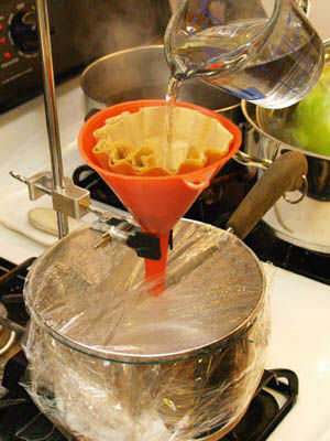 Usando una taza de una medición de taza (o recipiente similar con un labial adecuado para verter), llenar el filtro con solución caliente y dejar escurrir. Mantenga transfiriendo solución caliente en el filtro hasta que toda la solución ha sido filtrada. Si el flujo a través del filtro disminuye demasiado, puede reemplazar los filtros. Tenga cuidado de no sobrellenar el filtro.