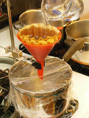 Usando una taza de una medición de taza (o recipiente similar con un labial adecuado para verter), llenar el filtro con solución caliente y dejar escurrir. Mantenga transfiriendo solución caliente en el filtro hasta que filtra toda la solución, teniendo cuidado de no para sobrellenar el filtro.