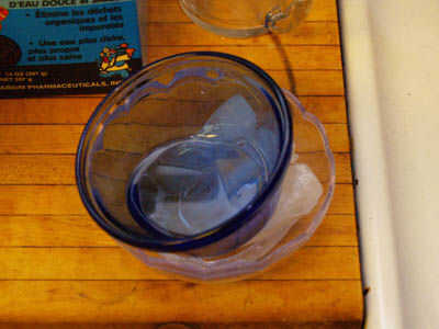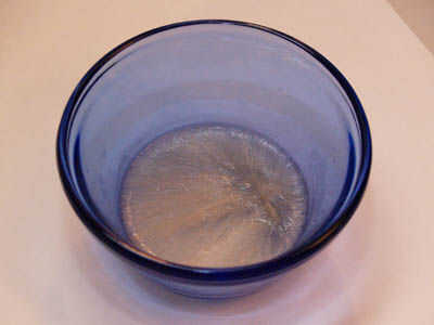 Transferencia con una cuchara de cocina limpia (o cucharón pequeño), una muy pequeña cantidad de solución (una a dos cucharaditas) en un plato limpio de natillas u otro recipiente pequeño; para ver la formación de cristales, es mejor utilizar un recipiente oscuro.
