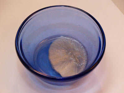 Enfriar el plato de natillas que contiene la muestra estableciendo en (o sosteniéndolo) el hielo (primera imagen). Después de un minuto o tan de la refrigeración, sople suavemente en la solución para ver si puede desencadenar cristalización. Si no pasa nada, puede eliminar la solución o volver a la solución hirvienda. Si no estás absolutamente seguro de que no ha sido contaminado con polvo o cualquier otra cosa, es mejor descartarlo.