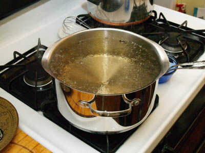 (Nota sobre el volumen de líquido en el cuadro - recordar que estoy haciendo un lote doble. Hay alrededor de un galón de líquido en esa foto, que es la mitad de lo que empecé con.)
