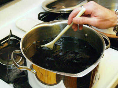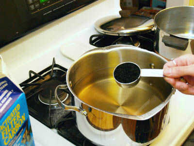 (En la primera foto, estoy usando una medida de 1/4 c. - mientras que esto debería ser más que suficiente para que el líquido en la olla, después tomé la foto decidí comercio de carbón para la velocidad y terminó añadiendo dos tazas, en lugar setting-up un embudo con un filtro de café para mantener el carbón de leña, a través del cual se podría verter la solución.)