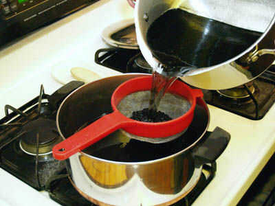 En primer lugar, verter la solución a través de un colador de alambre pequeño en la segunda vasija. Esto eliminará los gránulos y partículas grandes. Si no desea guardar el carbón de leña para otro proyecto, puede omitir este paso (el paso de filtración siguiente les quitará así, y significativamente no frenar ese paso).