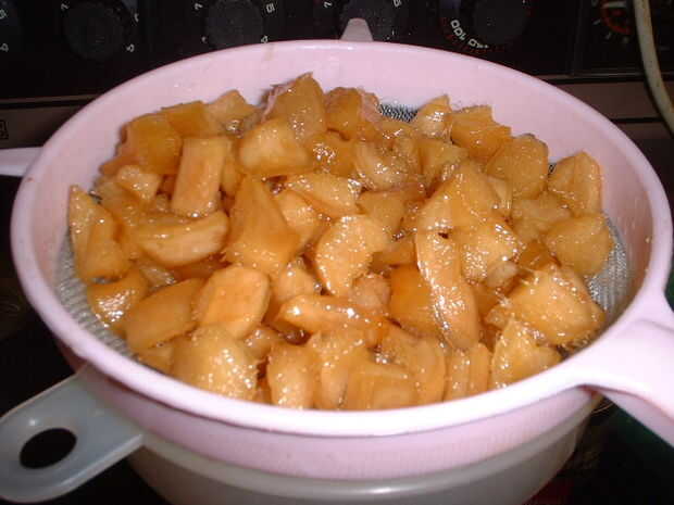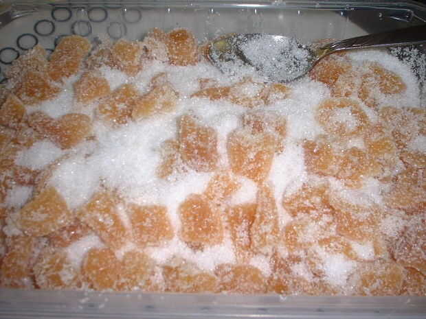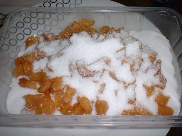Se añade más azúcar y remueve las piezas, entonces poco más de azúcar espolvoreado por encima y toda la masa se deja enfriar.