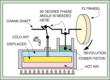 El motor de ciclo Stirling fue inventado por Robert Stirling en 1816, lo que ha sido alrededor por un tiempo. Es un motor térmico y se basa en un ciclo de calentamiento y enfriamiento de un gas (generalmente aire) contenido dentro del motor. Puesto que un motor de Stirling es hermético, durante la fase de calentamiento la presión interior aumenta y durante la etapa de enfriamiento la presión disminuye. Un displacer conectado al cigüeñal mueve el aire interno del lado caliente al lado frío de un cilindro. El cambio en la presión impulsa un pistón de potencia, que también está conectado al cigüeñal. Puesto que hay dos etapas, calientes y frías, es un motor de dos tiempos