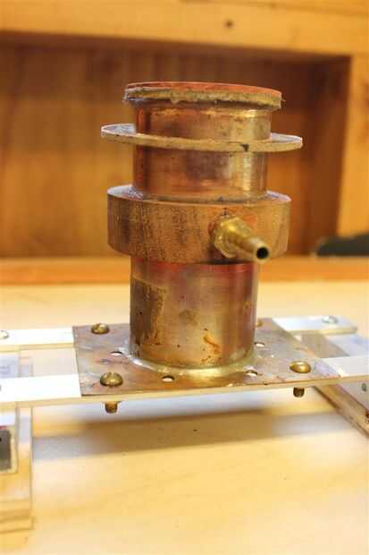 El cilindro del desplazador se hace de dos secciones de 2" tubos de cobre de diámetro, separadas en medio por un espaciador de madera. La madera sirve como rotura de puente térmico entre la sección caliente y refrigerador sección anterior. La placa en la parte inferior también es de cobre, soldadas a la sección de tubo con soldadura de tuberías libre de plomo de 95/5. Esta soldadura tiene un punto de fusión de 450° F (232° C), por lo que la fuente de calor tiene que ser controlada. La temperatura de funcionamiento con dos velas es 250° F (121° C). Otra limitación es la temperatura del pegamento de epoxy usada para unir las secciones de tubo de cobre para el espaciador de madera; Adhesivo epoxy normal es aceptar a unos 350° F (177° C). La culata es de aluminio y está atornillada a una brida de acoplamiento, que se pega en el cilindro superior. La culata es contacto metal a metal con el cilindro superior de cobre, por lo que puede haber transferencia de calor entre el cilindro y la cabeza, por lo tanto ambos cilindros y cabeza puede irradiar el calor y enfría el aire dentro. Utilicé una pieza de teflón para el cojinete de la cabeza del cilindro.