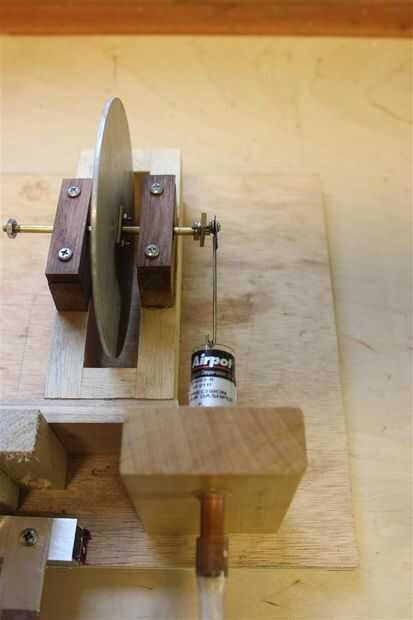 El pistón de potencia y el cilindro impulsión del motor, usando ciclos de presión desde el cilindro del desplazador. Ellos son los únicos comprar componentes en este motor. El pistón está hecho de grafito, la botella es de cristal; las piezas se fabrican para cerrar tolerancia y son prácticamente libre de fricción y de aire apretado. Pegué el cilindro de vidrio en un 3/4" diámetro agujero aburrido en un bloque de madera; enfrente el cilindro es un tramo corto de tubería de cobre de 1/4".