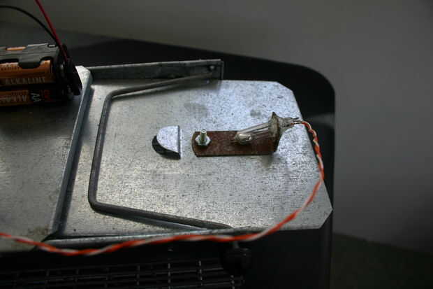 Aquí utilicé un viejo soporte de desecho L y conectado a la trampa. Luego usé una herramienta Dremel para cortar un orificio oval en el soporte. A continuación, simplemente se utiliza pegamento caliente para fijar el interruptor en su lugar. Montaje muy simple!