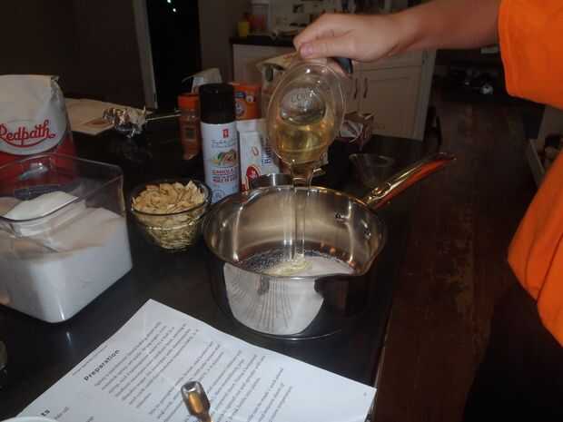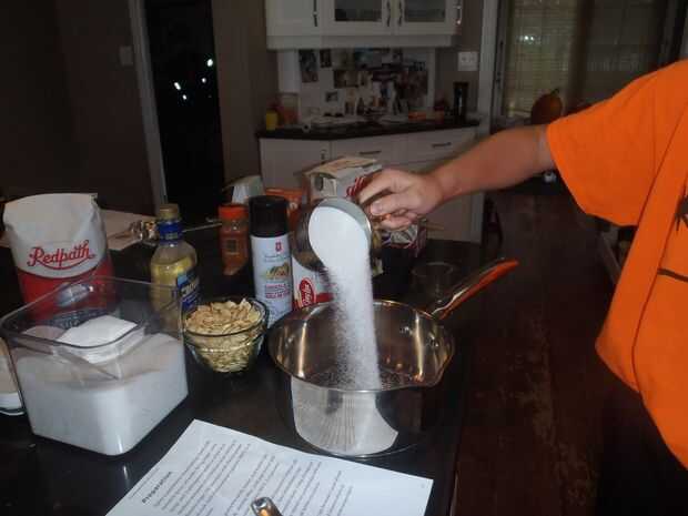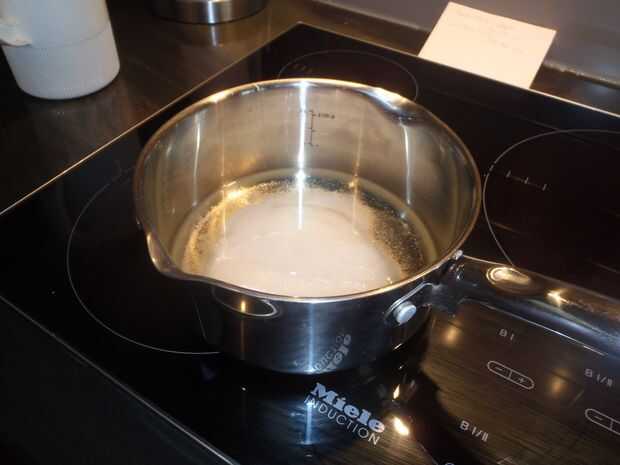 Poner el azúcar, el jarabe de maíz y 3 cucharadas de agua en la cacerola y poner a hervir sobre fuego medio, revolviendo para que el azúcar se disuelva.