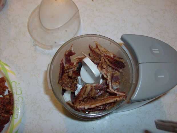 Freír el tocino hasta que esté tan crujiente como quieras, luego dejar de lado que se enfríe.  Una vez se haya enfriado a temperatura ambiente (trata de no comer demasiado!) picar bien en un procesador de alimentos o con un cuchillo (me gusta el procesador, pero tienes que mantener las cosas frías - utiliza impulsos en lugar de una chuleta largo).