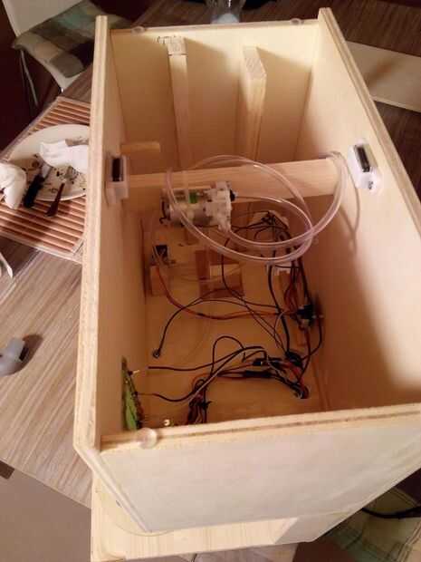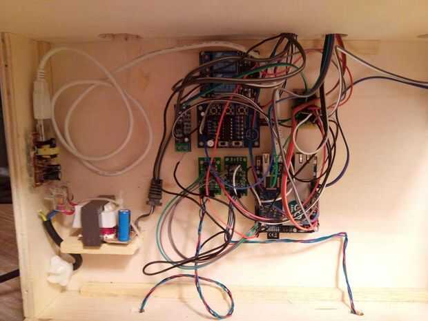 Substancialmente, se trabaja con voltajes de 2: 9v para agua bomba, LM386 y ds1820 5v encender el Yun, el escudo de relé, la pantalla y seguir advirtiendo que cualquier voltaje de 5v fríen su YUN. Hice una pequeña perforada para agrupar toda la potencia de 5v y estrellas de tierra (ver foto). Facilita las conexiones.