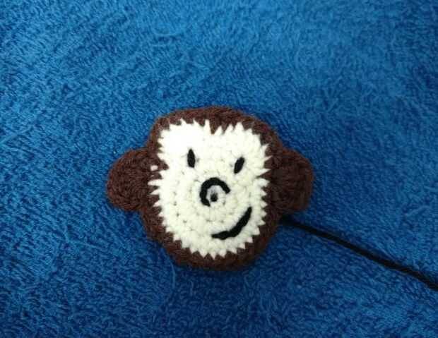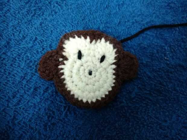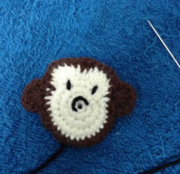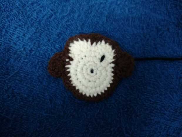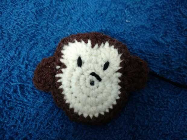 Coser en ojos, nariz y media sonrisa con hilo negro. Una simple cosa que podría hacer aquí es mientras cose el hilo negro siga las líneas de puntada de ganchillo especialmente para la boca de media sonrisa.