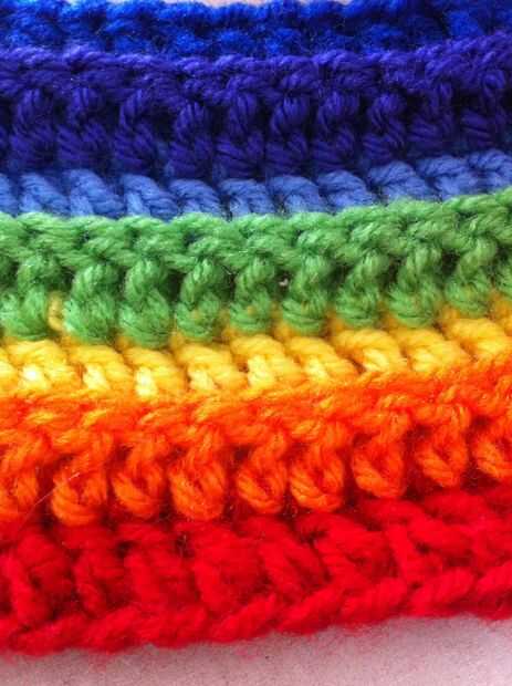Fila 4-7: cambiar colores próximos al amarillo, verde, azul claro, azul oscuro y púrpura (continuar dc en la espalda para hacer el efecto acanalado)