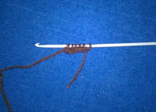 Repita este proceso dos veces, pasar a la siguiente puntada en la fila anterior cada vez. Cuando haya terminado, debe tener 6 lazos en el gancho.