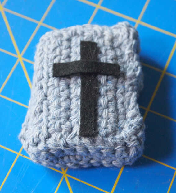 Coser la pieza lateral a la parte superior. Cortar y pegar en una cruz con fieltro negro. El ataúd se coloca sobre el módulo de sonido.