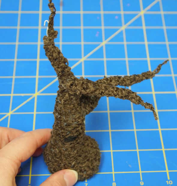 Coser las dos ramas del árbol. Puesto que el árbol necesita soportar el peso del esqueleto, usé algunos alambre tallo floral que corría por la longitud del tronco fuera de la base.