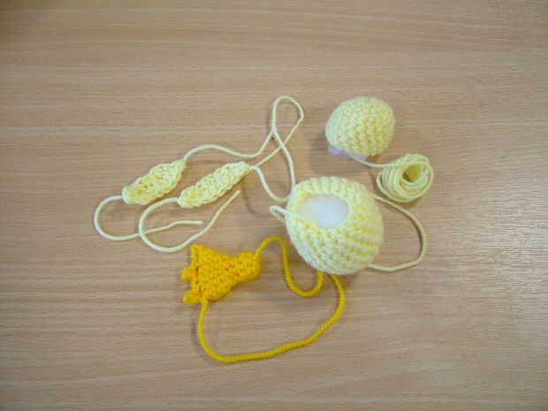 Tensar el hilo de inicio para cerrar el agujero y coser en los extremos del hilo. Rellene la cabeza libremente.