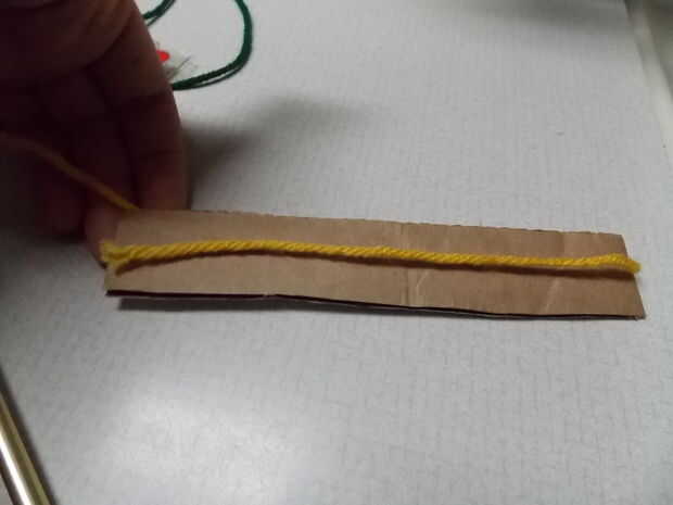 Corte un pedazo largo de hilo y cola después que envuelva totalmente el cartón, cerca de 3 veces la longitud de su cartón. Pisar el extremo del hilo por la aguja. Coser alrededor un lado de la lana sobre la cartulina, haciendo pequeños paquetes.