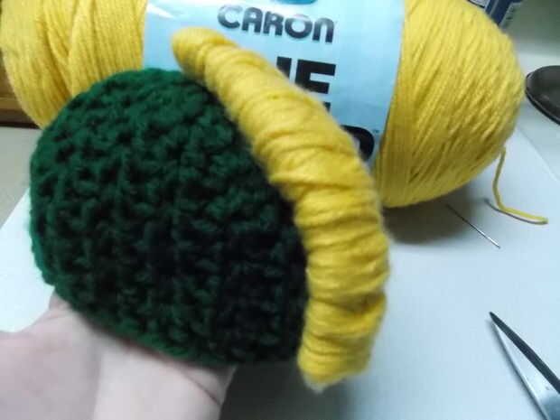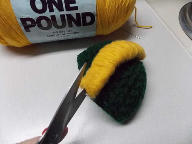 Con el hilo restante coser en sombrero. Cortar el hilo para crear al poof.
