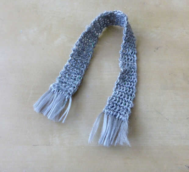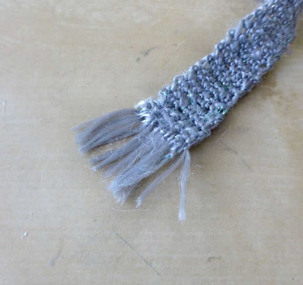 Coser en algún hilo iridiscente (si lo tienes). Entonces añadí una franja a ambos extremos de la bufanda. (Hice el flequillo igual como he añadido el cabello en el paso 12).