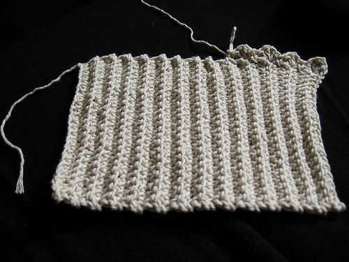 Vas a tener amplia, sueltos los espacios entre cada "costilla", a lo largo del borde largo de la tela (en un círculo en la segunda foto abajo). De ganchillo por el borde largo, solo crochet en espacios reducidos y doble ganchillo cuatro veces en cada espacio suelta.